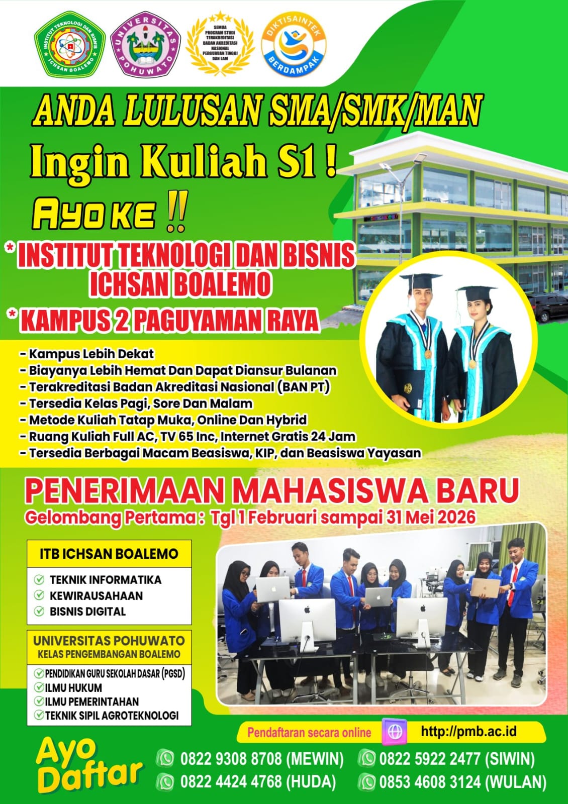 IKRARnews.ID, Boalemo — Institut Teknologi dan Bisnis (ITB) Ichsan Boalemo Kampus 2 Paguyaman secara resmi membuka Penerimaan Mahasiswa Baru (PMB) Tahun Akademik 2026. Pendaftaran dibuka bagi lulusan SMA/SMK/MA yang ingin melanjutkan pendidikan ke jenjang Strata Satu (S1).