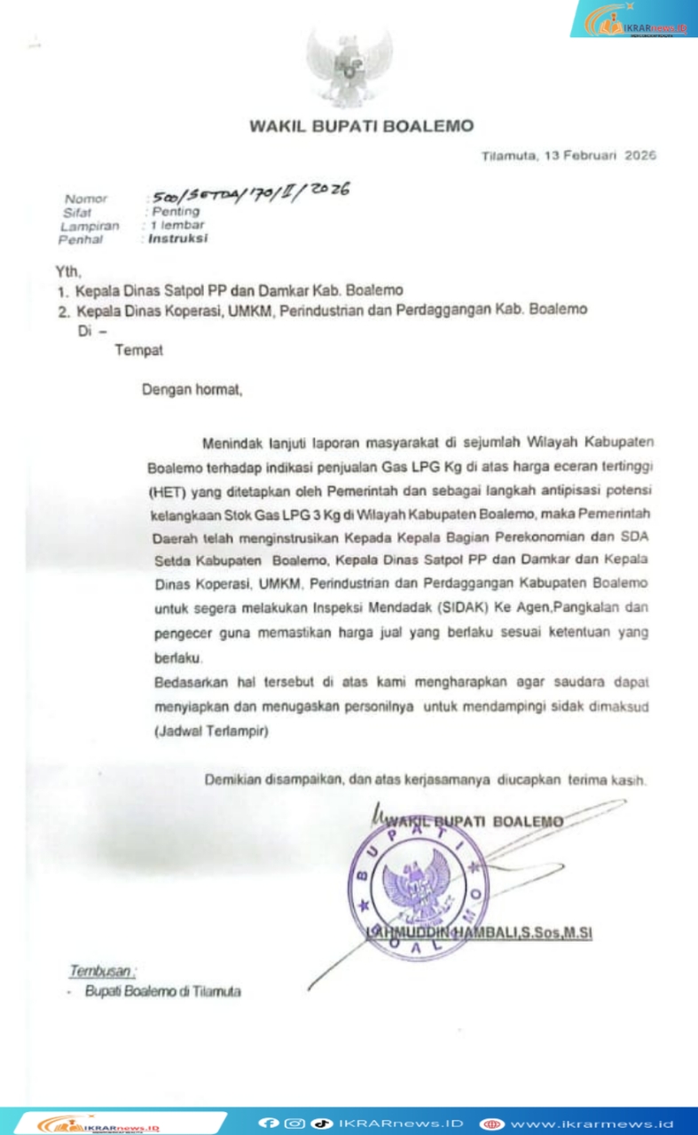 Instruksi tersebut tertuang dalam surat Pemerintah Daerah Nomor 500/Setda/170/II/2026 yang memerintahkan Koperindag, Satpol PP dan Damkar, serta Bagian Perekonomian dan SDA Setda Boalemo untuk turun langsung ke agen, pangkalan, dan pengecer LPG 3 Kg. Sidak ini bertujuan memastikan harga jual sesuai ketentuan serta mengantisipasi potensi kelangkaan stok.